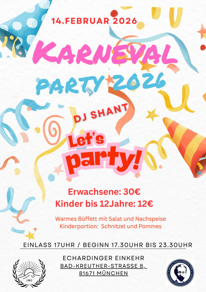 Sehr geehrte Mitglieder und Freunde, wir möchten die närrische Zeit feiern und laden Sie, Ihre Freunde und Familie herzlich zu unserem Fasnachtsfest am 14.02.2026 in der Echardinger Einkehr ein. Erleben Sie einen fröhlichen, tanzreichen Nachmittag bis in den Abend hinein – mit Spiel, Spaß und guter Gesellschaft für Jung und Alt. Verkleidung ist willkommen! Für das leibliche Wohl sorgt ein reichhaltiges Büffet mit Schweinebraten(Knödel und Krautsalat, bunter Salat) oder alternativ Kässpätzle und einer leckeren Nachspeise. Eine Kinderportion mit Schnitzel und Pommes ist ebenfalls erhältlich. Bitte um schnellste Reservierung und Erwerb der Eintrittskarten bis spätestens zum 05.Februar per Überweisung auf unser Konto: GLS-Gemeinschaftsbank eG., IBAN: DE04 4306 0967 8219 2746 00; BIC: GENODEM1GLS, mit dem VERWENDUNGSZWECK : 14.2. FASCHING – FAMILIENNAME – ANZAHL ERWACHSENE-ANZAHL KINDER Հարգելի՛ անդամներ և բարեկամներ, Սիրով հրավիրում ենք Ձեզ, Ձեր ընտանիքի անդամներին և բարեկամներին մասնակցելու մեր ուրախ դիմակահանդեսային տոնակատարությանը Օր՝ 14.02.2026 թ. Ժամը` 17։00 ից Վայր՝ Echardinger Einkehr Ձեզ սպասում է ուրախ ու ջերմ մթնոլորտ՝ լի պարերով, խաղերով և զվարճալի պահերով, որոնք կշարունակվեն կեսօրից մինչև երեկո՝ նախատեսված թե՛ մեծերի, թե՛ փոքրերի համար։ Դիմակահանդեսային հագուստը ցանկալի է։ Հյուրասիրություն Կգործի հարուստ բուֆետ՝ • խոզի տապակա(շվայնբղատեն, կնյոդլեր, թթու կաղամբի աղցան, գունավոր աղցան) • այլընտրանք՝ պանրային շպեցլե • համեղ աղանդեր Երեխաների համար՝ շնիցել և ֆրի կարտոֆիլ Խնդրում ենք մինչև 05.02.2026 թ. կատարել տեղերի ամրագրումն ու մուտքավճարի վճարումը՝ փոխանցման միջոցով՝ նշելով փոխանցման նպատակը:14.2. Fasching – ազգանուն – մեծահասակների քանակ – երեխաների քանակ (GLS-Gemeinschaftsbank eG., IBAN: DE04 4306 0967 8219 2746 00; BIC: GENODEM1GLS) Ուրախությամբ սպասում ենք Ձեզ: